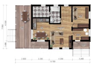 - Первый этаж: кухня-гостиная 35,44 м2 с 2мя выходами на террасу, спальня, прихожая, санузел 5,37 м2 и техническое помещение, подходящее под условия газового оборудования.