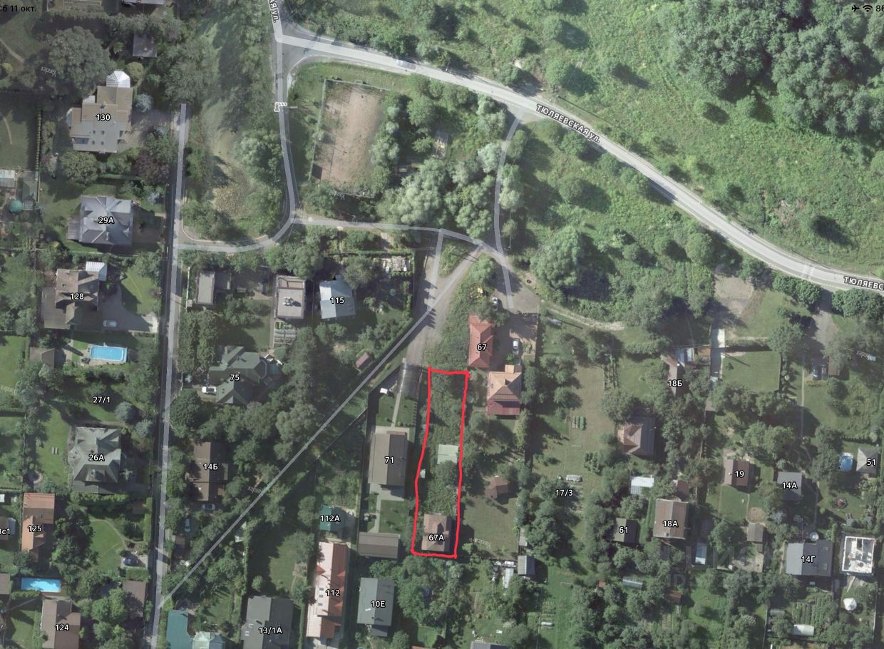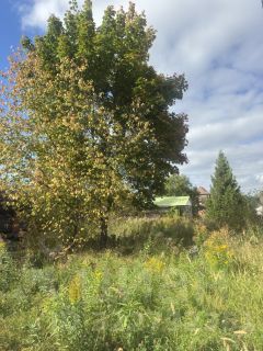 Участок прямоугольной формы, сухой, с взрослыми деревьями, создающими уют и приватность.