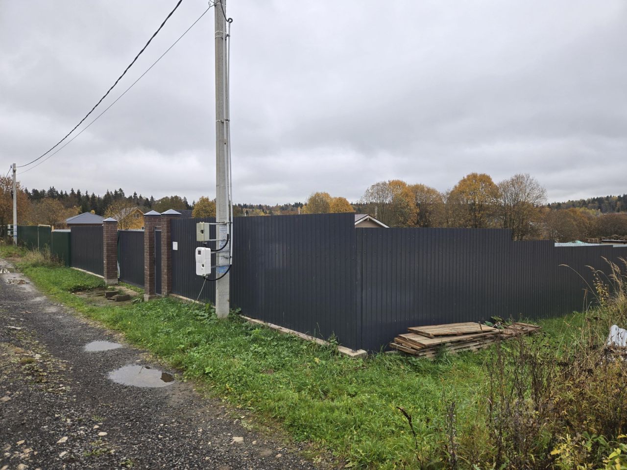 На участки есть забор из профнастил. Откатной варота и калитка . .3шт тумба из кирпичные облицовка.