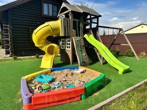 * многофункциональный детский комплекс (качели, горки, домик для игр, песочница) на твёрдом покрытии, застеленном искусственным газоном;
