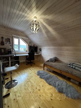 — По планировке в доме предусмотрено 2 входа: кухня-гостиная 30 м2 с выходом на террасу, 4 спальные комнаты (1 комната на первом этаже и 3 комнаты на втором этаже), два санузла, прихожая. Высота потолков на первом этаже 2,70 спальня на втором этаже 3.30