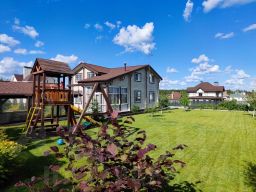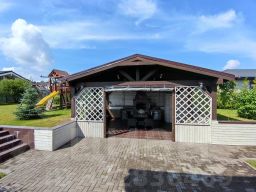 На участке 12 соток: ландшафт, плодовые деревья (яблони, сливы, вишня), кустарники (смородина, малина, орешник, рябинник), липа, сирень, клен, туи, ели, зона Барбекю с мангальной зоной, обеденной зоной, туалетом 30 кв.м. Детская игровая площадка. Автомобильный навес на два авто с хозяйственным помещением.