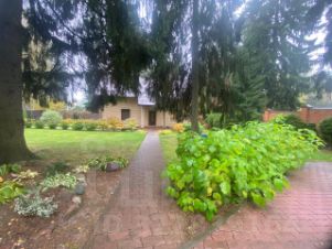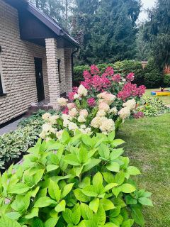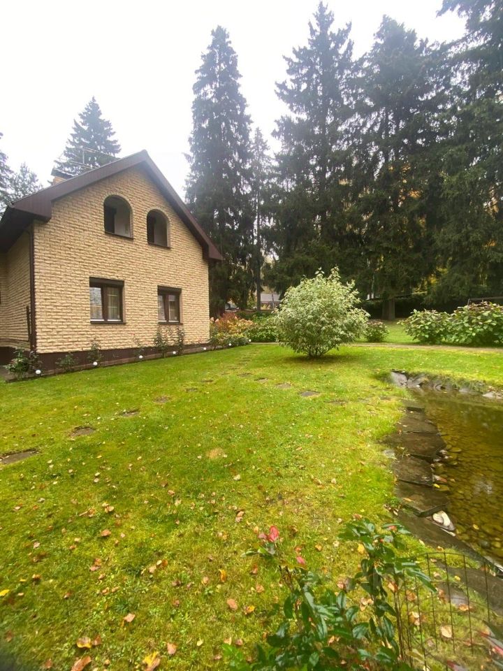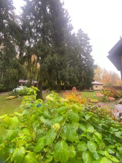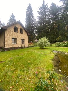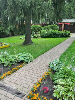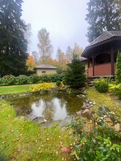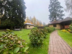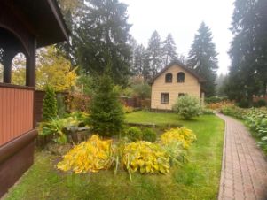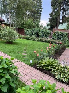 Участок 13,5 соток очень ухожен, утопает в зелени, взрослые ели, туи, гортензии, розы, газон, небольшой пруд.Дренаж по всему участку. Стоянка на 3 авто,дорожки выложены брусчаткой.