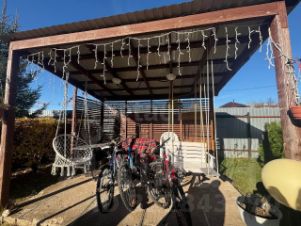 *На участке отдельная постройка в два этажа на фундаментной плите размером 70 кв.м 7х7 м. Стены выполнены из газосиликатных блоков толщиной 300 мм + 50 мм утепление, штукатурка. Вывод канализации в отдельный септик. Электричество заведено. Большая площадь остекления. Большая лоджия с видом на участок. Без чистовой отделки.