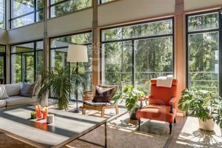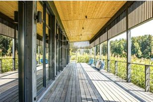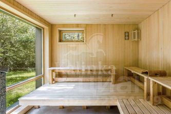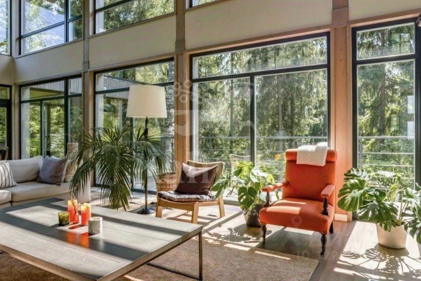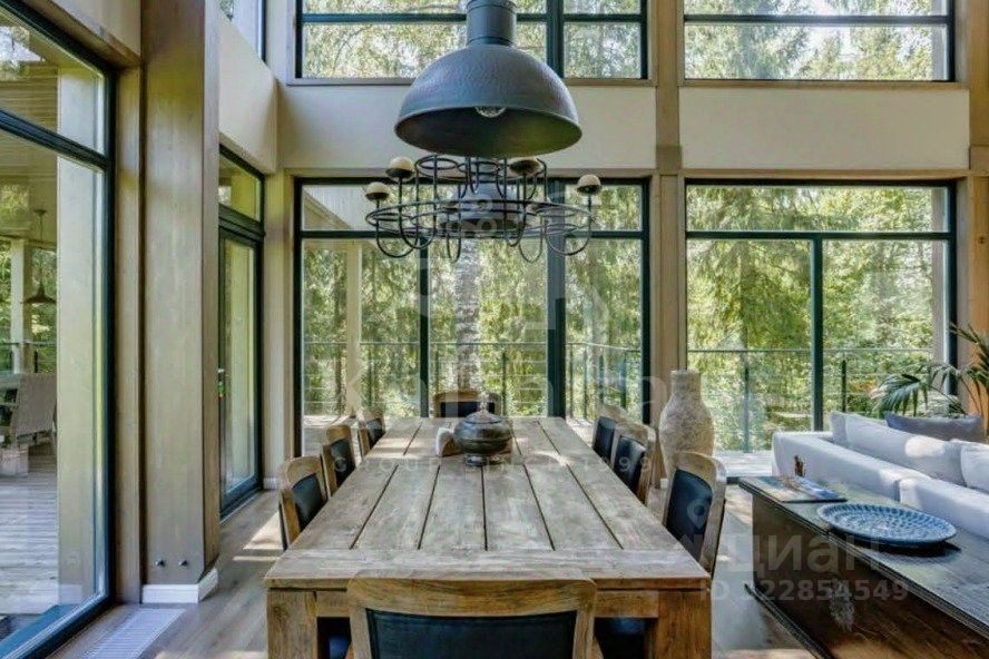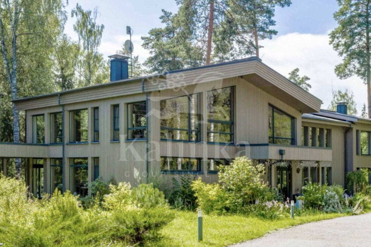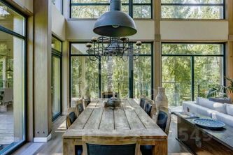 Функционализм здесь выверен с точки зрения эстетики. Комфортное и эргономичное пространство спроектировано с учётом всех требований большой семьи. Экстерьер дома величественный и в то же время современный и уютный. Панорамные окна впускают внутрь дома обилие света и окружающей природы, что позволяет чувствовать себя уединённо и спокойно, наслаждаясь всеми прелестями загородной жизни. Стильные современные решения, выполненные с любовью и великолепным вкусом, наполняют дом уютом и теплом. Большое открытое двусветное пространство гостиной- кухни-столовой, залитое солнечным светом благодаря панорамным окнам. Уюта добавляет каменный финский камин Tulikivi.