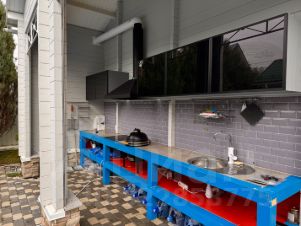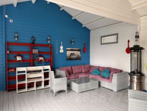 Кроме основного дома на территории участка расположены — летняя кухня, навес для водной техники с огромной террасой с лаунж-зоной, отдельная зона для персонала с комнатой и душевой, навес для машин.
