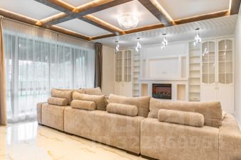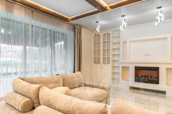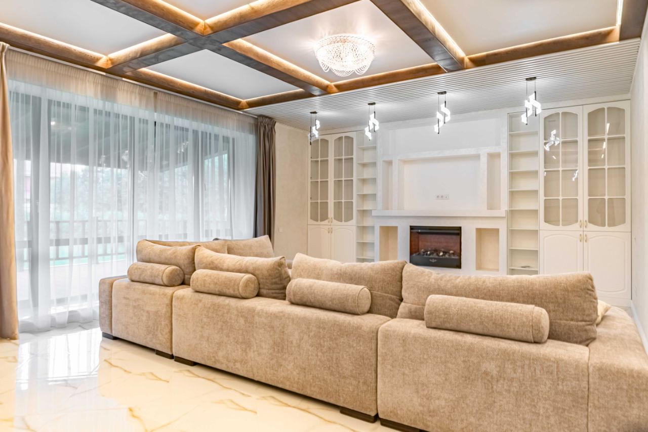- Просторная гостиная (65 м²) с камином и панорамными окнами, отдельный выход на террасу и участок.