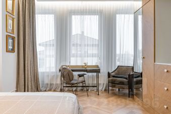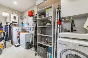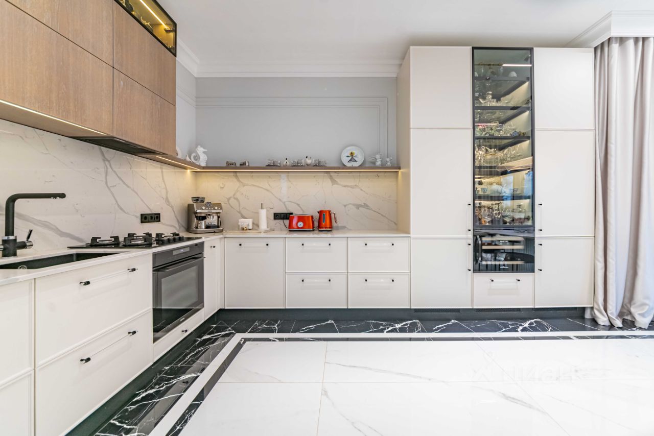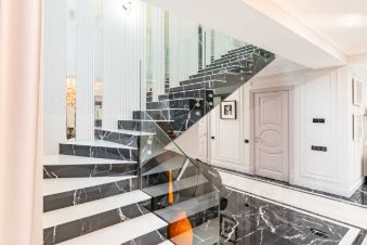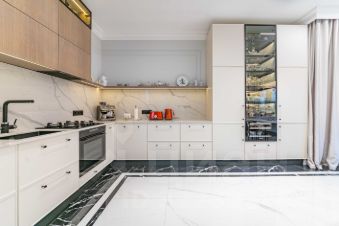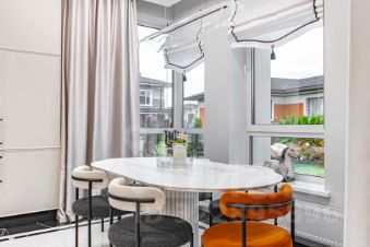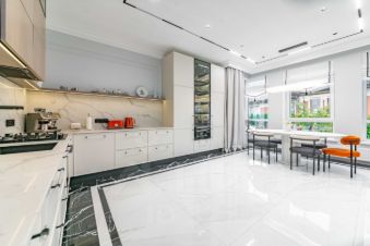 На первом этаже расположены просторная кухня-столовая премиум-класса, гостиная с камином, а также гардеробная и спальня, большой санузел. Техническая комната (котельная) оснащена оборудованием Buderus. Кухня укомплектована профессиональной мебелью и встроенной техникой высшего класса от Asko и Korting.