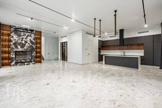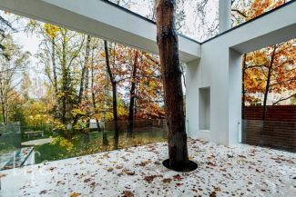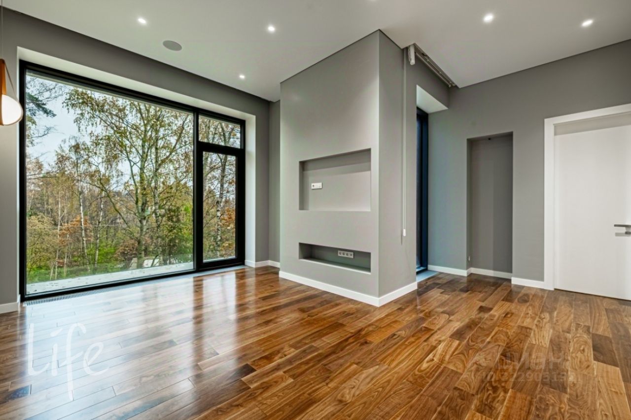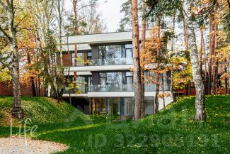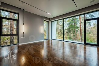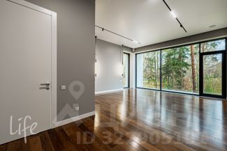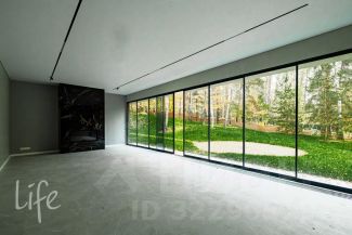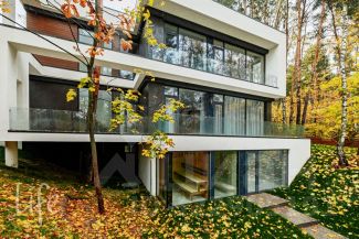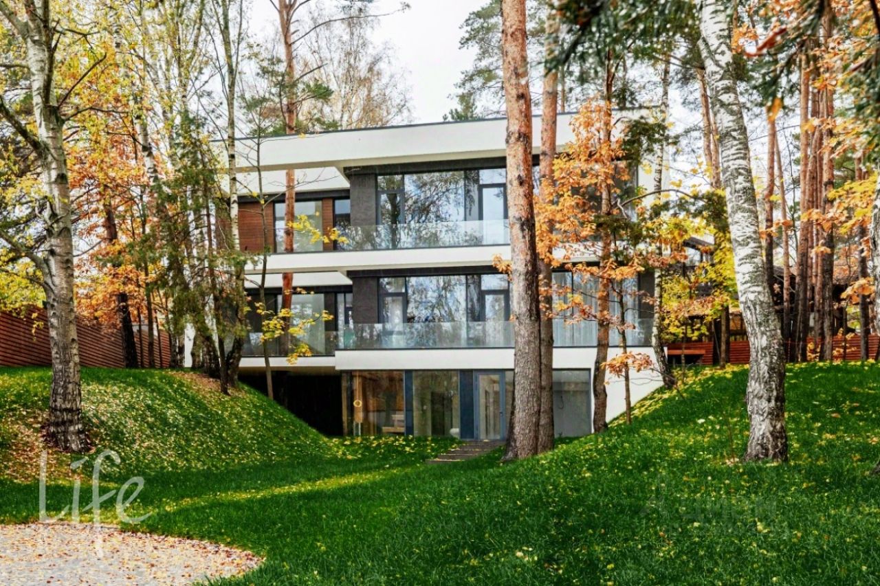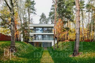 Коттеджный поселок "Веледниково". Вкусная архитектура, гармонично вписанная в природный ландшафт. Осенний пейзаж. Новый, современный дом в стиле хай-тек, панорамное остекление, плоская кровля. Полностью под ключ, установлена кухонная мебель с островом, встроенная мебель.