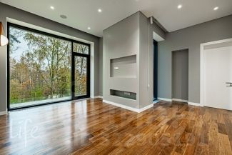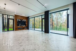 Интерьер в светлых мягких тонах, со вкусом подобрана кухонная и встроенная мебель. Гостиную украшает дровяной камин. А благодаря большим панорамным окнам в доме всегда светло и атмосферно. Каждое окно — как дверь в природу, окружающую дом.