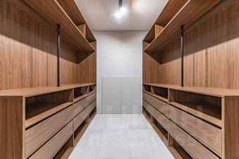 Первый этаж включает просторный холл, гардеробную, кухню-столовую-гостиную с выходом на крытую веранду, комфортабельную спальню, санузел, котельную и постирочную. На втором этаже расположены хозяйская спальня с гардеробной и санузлом, а также две спальни с гардеробными и санузел.