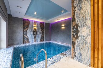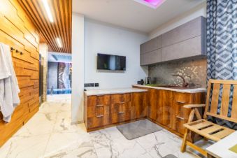 На участке в 13 соток расположены два гаража с крытыми парковками, беседка для барбекю с каменной печью и отдельное здание с баней и спортзалом (парная, хамам, бассейн, зона отдыха, санузел, прихожая, спортзал) площадью 86 м² с выходом на террасу.