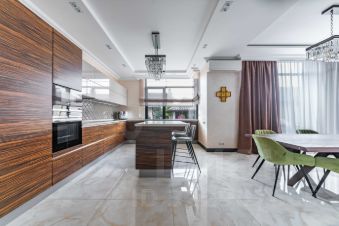 Полностью меблированная кухня оборудована гарнитуром от HECKER (Германия) и современной встроенной техникой: холодильником и морозильной камерой Liebherr, духовым шкафом, микроволновой печью, индукционной варочной панелью, посудомоечной машиной и винным шкафом от Siemens.