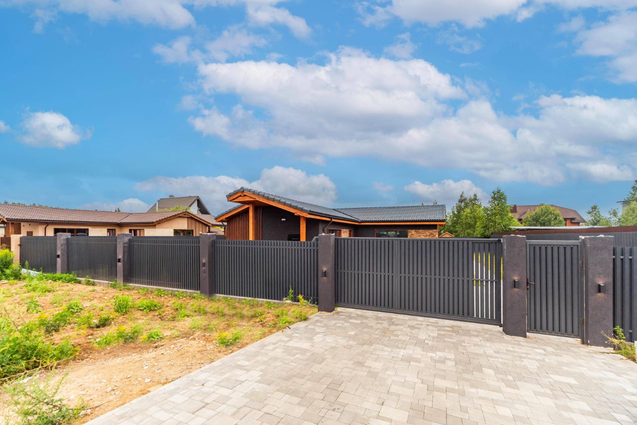 Въездная группа с откатными автоматическими воротами и паркинг на две автомашины.