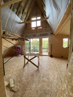 Продается каркасный дом в деревне Микишкино в 8 км от Дмитрова. Общая площадь здания составляет 76 кв. м, на участке 6 соток правильной формы. Дом находится на этапе строительства, что предоставляет новому владельцу возможность самостоятельно выбрать финишную отделку и планировочные решения под свои задачи, сэкономив на стоимости готового объекта. Проект предполагает две жилые комнаты и кухню. Участок полностью огорожен по периметру комбинированным забором из сетки рабицы и дерева, начато оформление ландшафта: высажены плодово-ягодные кустарники и деревья.