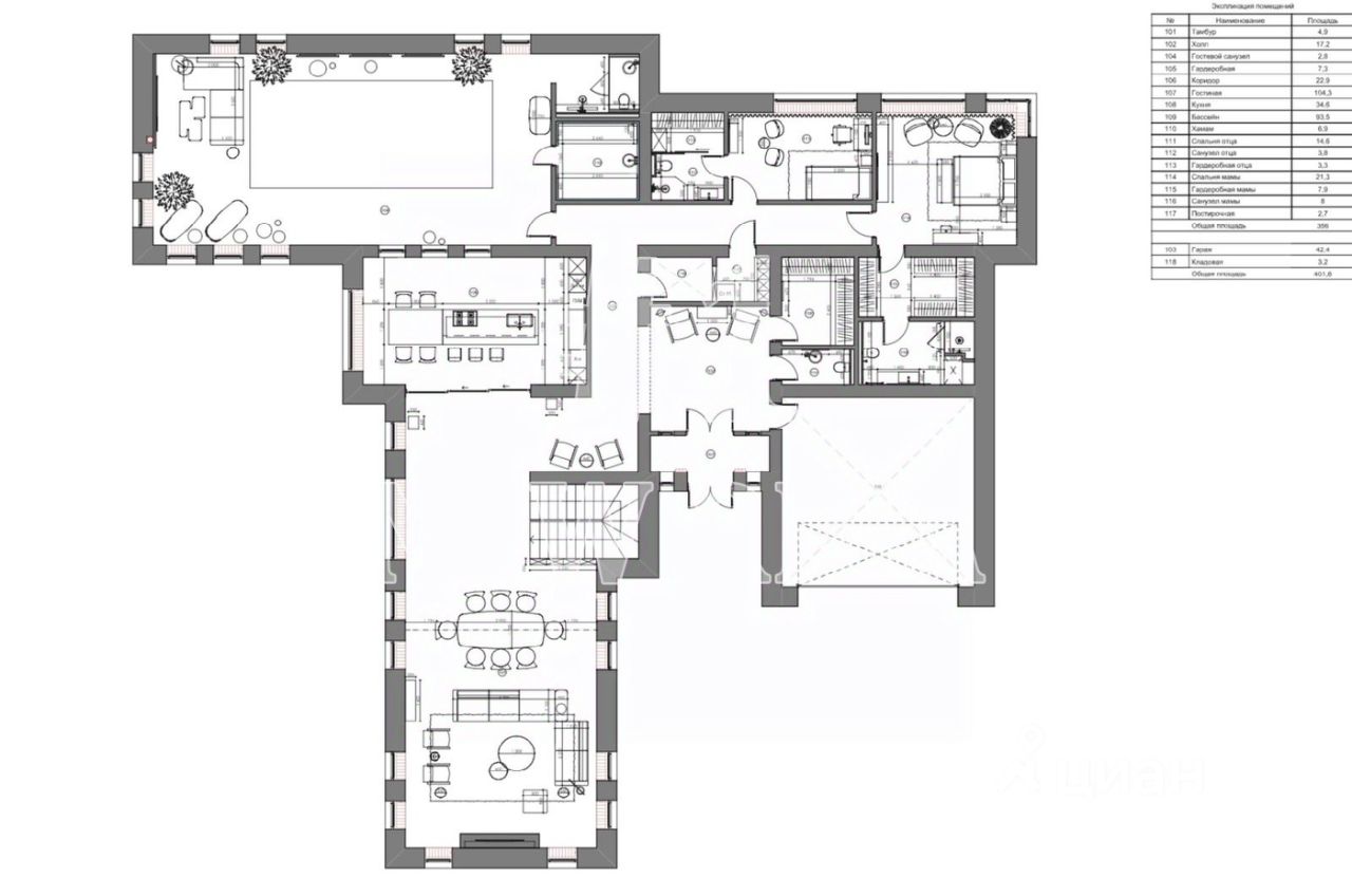 1 этаж - 2 спальни с собственными с/у и гардеробными, гостиная с камином, кухня, столовая, бассейн, хамам и зона отдыха, гараж на два авто и дополнительная парковка под навесом,