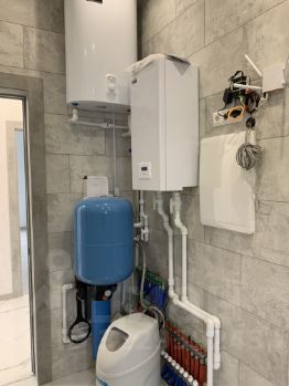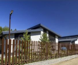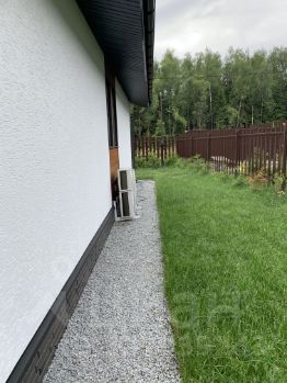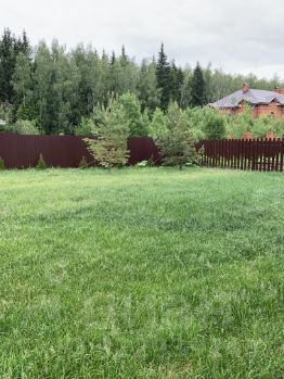 Огороженный участок по периметру, калитка и автоматические ворота, парковка дорожки на бетонном основании и вымощена брусчаткой, высажены молодые сосны, туи и засеян газон.