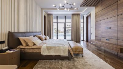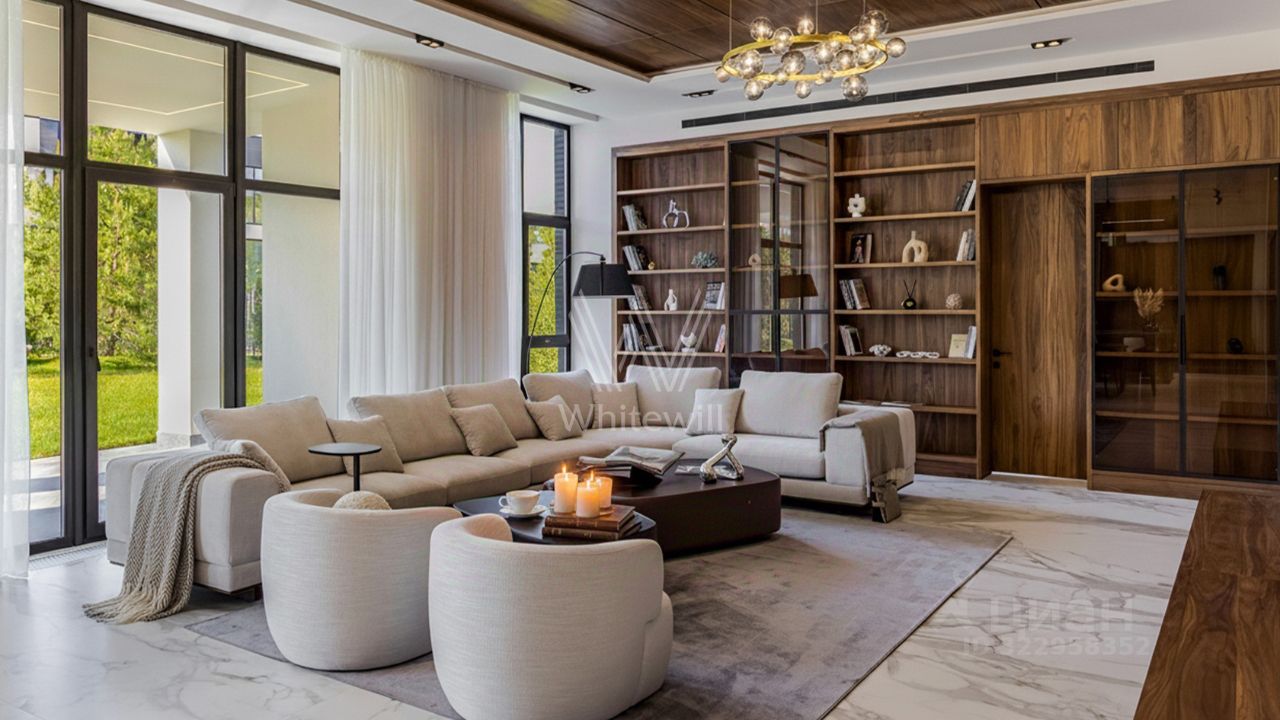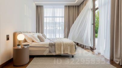 Интерьеры оформлены в современном стиле, где преобладают мягкие нейтральные оттенки. Натуральные древесные текстуры вносят акценты, добавляя пространству теплоту и сложность. Панорамные окна и многоуровневые потолки с тщательно продуманным освещением создают игру света и тени, создавая атмосферу уюта и гармонии. Дом полностью меблирован и укомплектован техникой от ведущих производителей.