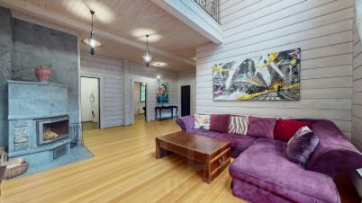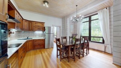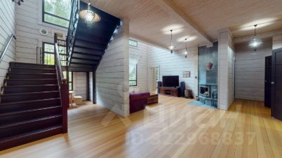 - на первом этаже: гостиная со вторым светом 42 кв.м и дровяным камином из талькохлорита, кухня-столовая с двумя окнами 22,5 кв.м и кладовой 3 кв.м, кабинет 16,5 кв.м, гостевая спальня 13,7 кв.м с собственной ванной комнатой 5 кв.м, гардеробная 3 кв.м, прачечная 4 кв.м, сауна 5,5 кв.м, душевая и санузел, потолки 3,06 метра;