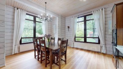 Дом из финского бруса 200 мм, заведены все коммуникации (газ, электричество 20 квт/ч, центральная канализация, вода из скважины (артезианская), есть колодец). Дом построен качественно, нет никаких перекосов, очень теплый, строили финны. Все инженерные коммуникации вынесены в отдельный технический дом.
