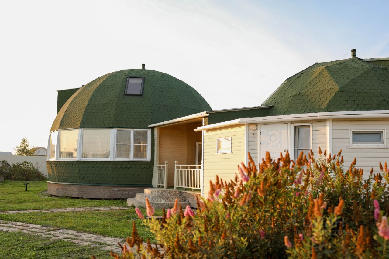 Дом состоит из двух куполов диаметром 6 и 9 метров с общей площадью 168 м². На участке расположена замечательная купольная русская баня на камнях с диаметром 5 метров, в которую заведены вода и свет. Въезд предусмотрен для двух автомобилей, а дорожки выложены тротуарной плиткой. Можно также рассмотреть вариант расширения участка.