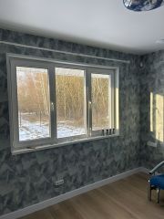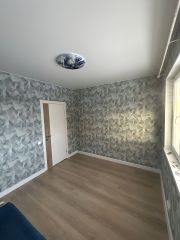 Стены и перегородки обшиты двумя слоями влагостойкого и звукоизаляционного гипсокартона и окрашены в местах общего пользования. В комнатах обои. Заполнение перегородок минеральная вата.