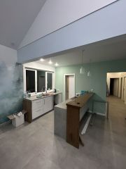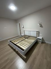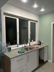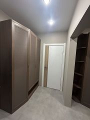 Смонтирована кухня с раковиной индукционной плитой и барной стойкой, предусмотрено место и коммуникации для посудомоечной машины.