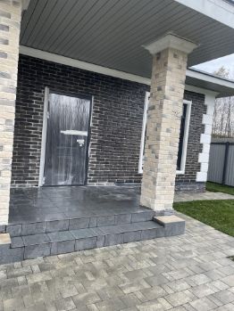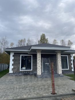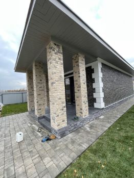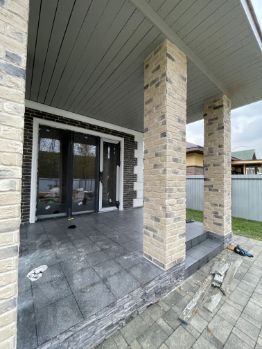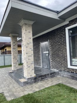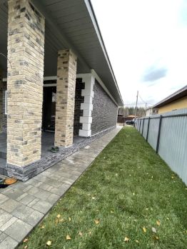 Фасад дома украшен натуральным камнем и изящной лепниной, что придаёт строению особый стиль и привлекательность. Большие окна обеспечивают отличное естественное освещение всех помещений.