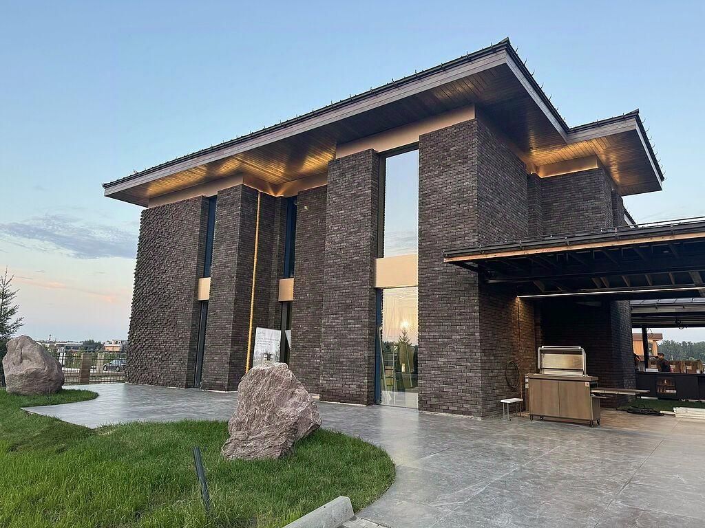 Архитектурный облик дома также заслуживает особого внимания. Облицовка выполнена в монохромной гамме тёмно-коричневого цвета, дополненная выразительной фактурой 3D-кладки и уникальной конструкцией крыши с глубокими свесами, создающими впечатление лёгкости и воздушности. Вечером здание преображается благодаря продуманному внешнему освещению, подчёркивающему эстетику архитектуры и делая этот объект настоящим произведением искусства.