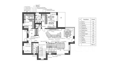 Дом общей площадью 389 м2 на земельном участке 10,5 соток. Потолки высотой 3,2 метра создают дополнительное чувство свободы и пространства. Внутреннее пространство помимо общих зон включает 3 спальни, 4 санузла и кабинет.