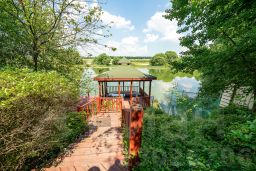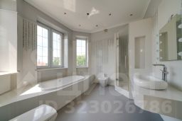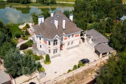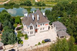 Участок 28 соток расположен на берегу пруда, что обеспечивает красивый вид из окон. . На территории участка растут взрослые деревья, 10-метровые сосны, цветы и кустарники, смонтирован автополив. Дорожки и придомовая территория вымощены камнем, на участке расположены каменный фонтан, пергола, лавочки из камня, каменные постаменты для статуй. Гараж с 2 крытыми теплыми машиноместами, смежный навес под машиноместо, большая площадка перед домом. Над гаражом расположена комфортная квартира для персонала 50 кв м.