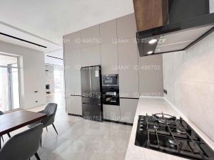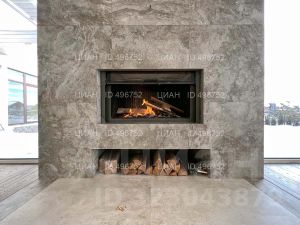 Зонированное пространство кухни-столовой -гостиной с камином 70 кв. м