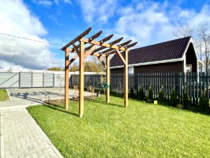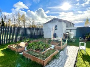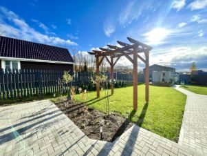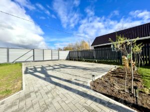2 семилетних яблони, которые уже плодоносят. Кустарники ежевики, смородины, голубики, крыжовника. Дорожки-тротуарная брусчатка. На участке так же сделана площадка под беседку. По периметру полностью огорожено +парковка на 4 машины с откатными воротами.