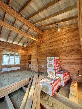 Утепление пола 300 мм утеплителем Isoroc. Наличие сетки от грызунов. Чистовой пол из фанеры. Материал для пола закуплен на 70%.