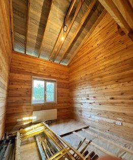 Дом построен в 2022 г. из профилированного бруса пас-шип 150*200 мм с учетом всех технологий. Покраска дома производилась немецким маслом Biofa (не выгорает и не облазит). Стропила, нижние венцы и лаги обработаны огнебиозащитой. Фундамент из железобетонных свай. Высокие потолки. Крыша является потолком. Площадь дома 100 м2. Проектом предусмотрены 2 спальные комнаты, кухня-гостиная 25 м2, санузел, прихожая, топочная/ хоз.комната, тамбур, терраса 15 м2.