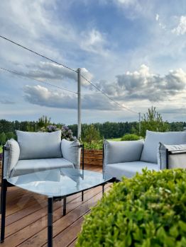 Газоблок Bonolit, кирпич Braer, кровля GrandLine, остекление Rehau, дверь Ягуар, терраса из натуральной лиственницы.