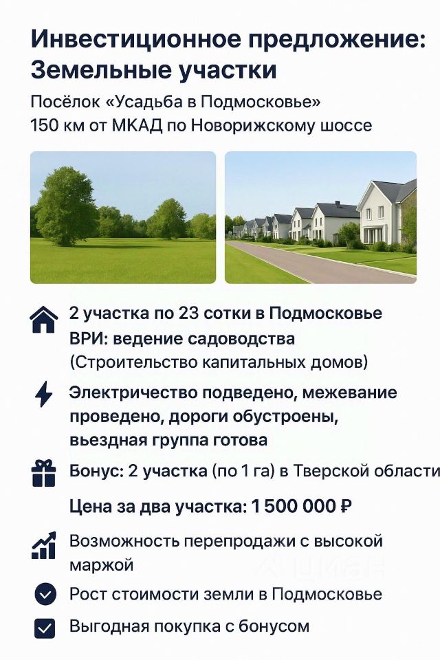 по Новорижскому шоссе. ВРИ Ведение садоводства (разрешено строительство капитальных домов). К участкам подведено электричество, в посёлке сделаны дороги, въездная группа. Цена ниже рыночной, плюс к каждому участку в подарок гектар земли в Тверской области. Цена указана за 2 участка + 2 подарочных гектара. При покупке одного участка + гектар в подарок цена 900 000 руб.