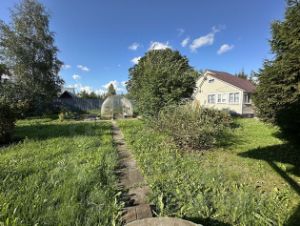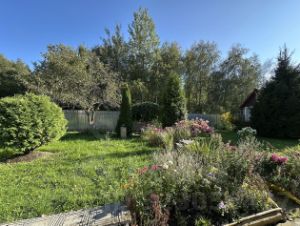 2 парника, грядки, много цветов, деревьев, в том числе елки, туалет.