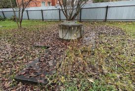 При въезде на участок большая бетонная парковка, въезд в гараж. участок ровный, прямоугольный, ухоженный, с каменными дорожками, большими хвойными и садовыми деревьями. Есть бревенчатая баня, хозблок, залита бетонная площадка под бассейн.