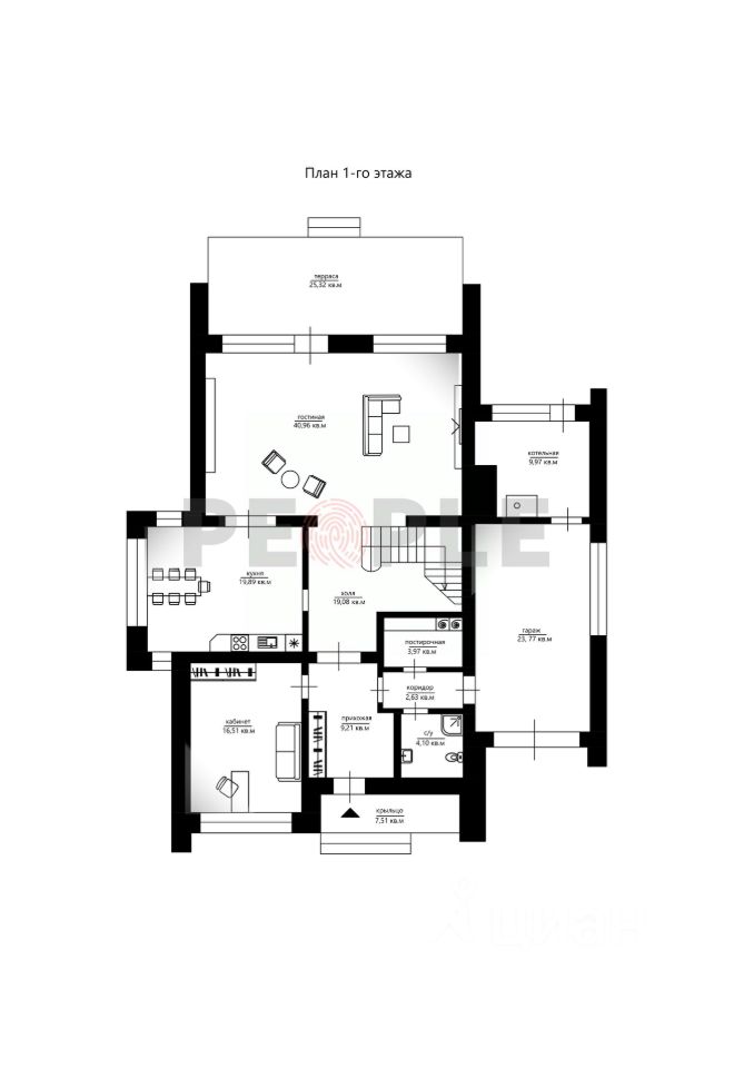 1-й этаж: холл, санузел, гардеробная, кабинет, кухня-столовая, гостиная с выходом на просторную террасу, постирочная, котельная.