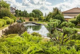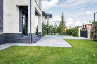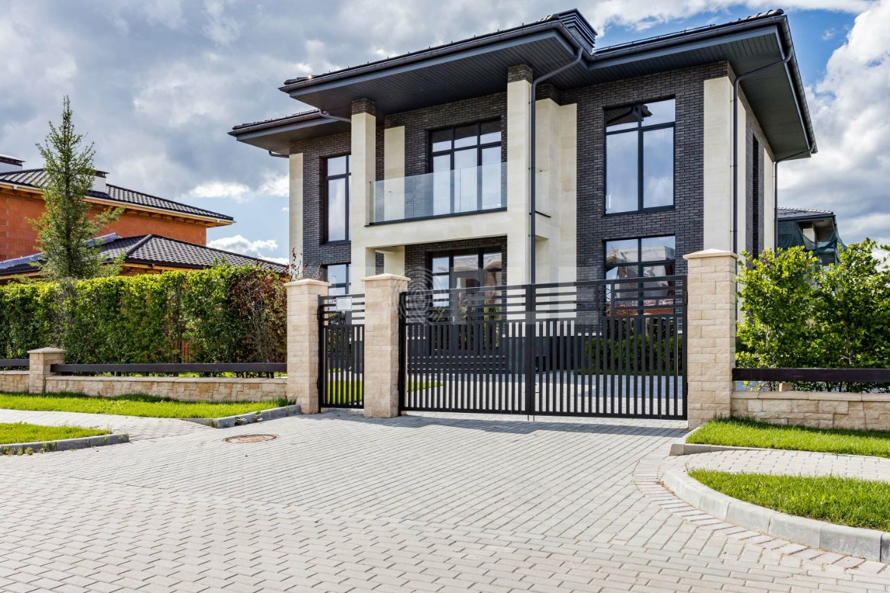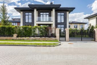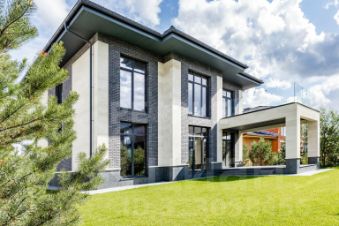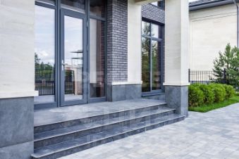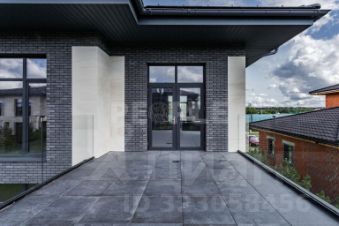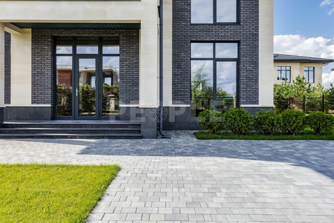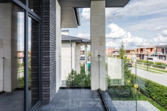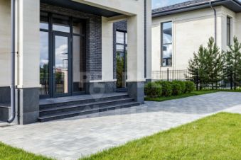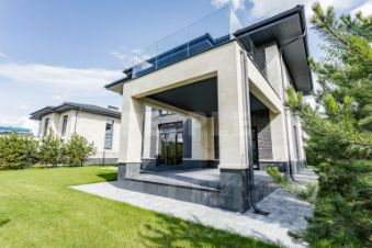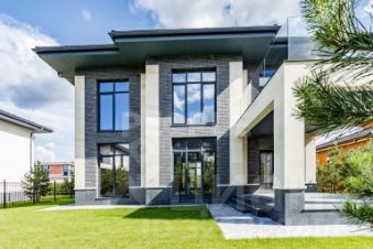 Дом построен на участке правильной прямоугольной формы размером 7,56 соток. По периметру высажены кустарники и деревья, а основная часть территории уложена газоном и готова к идеям по благоустройству. Внешняя отделка дома выполнена премиальными материалами в серо-молочной гамме: декоративный кирпич, натуральный песчаник, цементно-песчаная черепица, планкен.