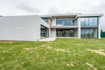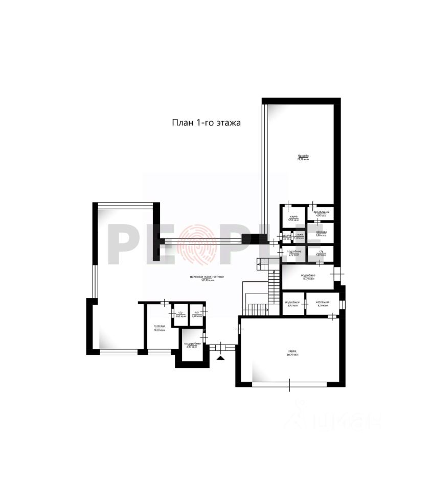 Первый этаж: холл, просторная гостиная-столовая-кухня с выходом на террасу, спальня/кабинет с санузлом, гардеробная, гостевой санузел, СПА-зона (бассейн, сауна, хаммам, раздевалка, санузел), гараж на 3 машины, котельная, кладовая, постирочная, подсобное помещение, комната для персонала с санузлом