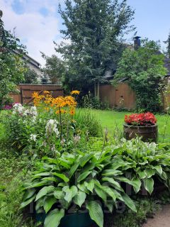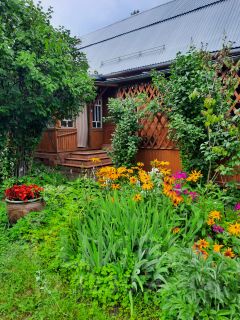 Участок ухожен: посажены малина, клубника, много цветов и декоративных кустарников.