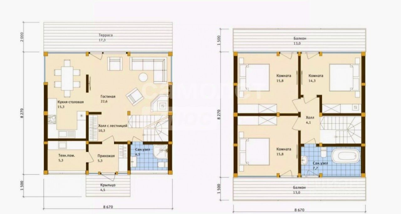Функциональная планировка, первый этаж: кухня-столовая 15,3 м2 ,гостиная 22,6 м2, холл 10,3 м2, санузел 4,5м2, прихожая 5,3 м2, котельная 5,3 м2. второй этаж: три спальни 15,8 м2, 15,8 м2, 14,3 м2, санузел 7,7 м2, холл 4,3 м2. выход на балконы с каждой спальни. потолки 2,7 м, двери 2,3 м. Терраса 17,3 м2 с выходом в сад. Располагается в районе с развитой инфраструктурой, в непосредственной близости Рига Аутлет. Перекресток, Магнит, Азбука вкуса, в непосредственной близости, школа и детский сад.