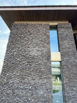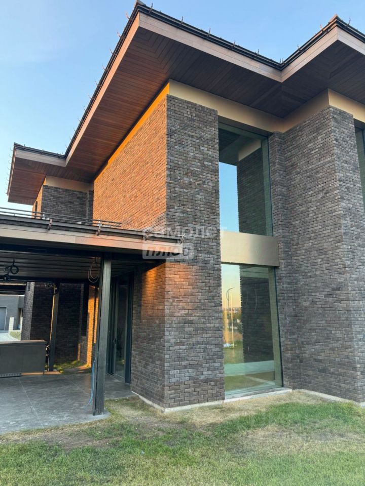 Фасад и архитектура — Монохром тёмно-коричневых оттенков, живая фактура 3D-кладки, эффект парящей крыши. Райтовские свесы в 130 см делают силуэт монументальным. В темноте подсветка превращает дом в арт-объект. Это архитектура, которая останется актуальной и через десятилетия.