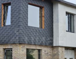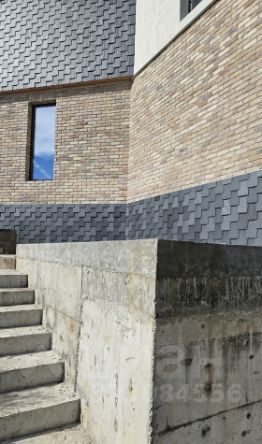 Фасад облицован плиткой ручной формовки в сочетании с натуральным итальянским сланцем в виде чешуи дракона .