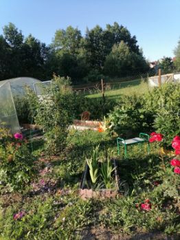 Участок 10 соток. Немного под уклоном, а значит всегда будет сухим. Со всех сторон обнесен забором: Металлический профлист и сетка рабица, сделаны въездные ворота. На участке выделено отдельное место для стоянки 3-х машин и место для барбекю. На участке посажены деревья и кустарники. Для любителей огорода сделаны грядки, установлены современные парники. По всему участку разбиты прекрасные цветники с большим количеством роз.