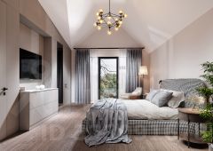 • Правое крыло занимает мастер-блок со спальней (20.5 кв. м) с выходом на террасу, санузлом (7.4 кв. м), гардеробной (13.8 кв. м) и кабинетом (10.3 кв. м).