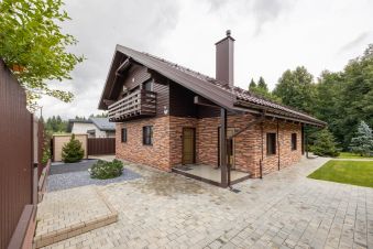 Дом площадью 177м2 (плюс 100м2 занимает подвал) построен из пеноблоков и облицован клинкерным кирпичом. В доме высокие потолки, панорамные окна, 2 больших балкона на втором этаже и просторная терраса с выходом на участок. Все внутренние деревянные конструкции выполнены из клееного бруса и лиственницы. Все центральные коммуникации. Электричество 10 кВт.