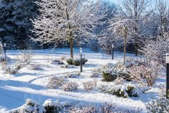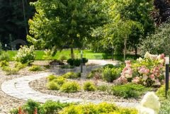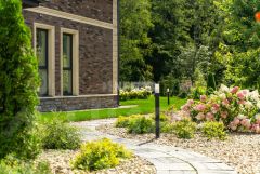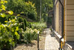 Сад с декоративными растениями, автополив, дренаж, освещение, мощение, индивидуальный выход в лес.